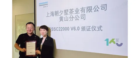 近日,朝夕墅茶业黄山茶厂(PWG)荣获 DNV 颁发的 FSSC 22000 V6.0 食品安全管理体系认证证书,这是 DNV 颁发的首张茶叶类 FSSC 22000 V6.0 认证证书。