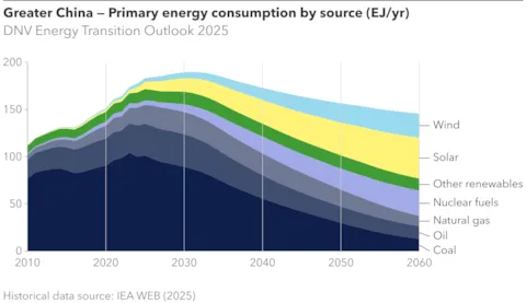 Coal used for power generation in 2024 in Greater China contributes 23% of the total global energy-related emissions and 50% of emissions in the region. Our results show an 86% reduction of coal for power by 2050. This happens without a substantial decrease in installed capacity, giving an average capacity factor of only 9% in 2050. Alternatively, it is possible to foresee more forced shutdowns among the most polluting units. Fossil energy sources combined will be dwarfed by renewables in electricity generation before 2030. The role of fossil fuels continues to shrink; they will support just 1% of electricity generation in 2060.