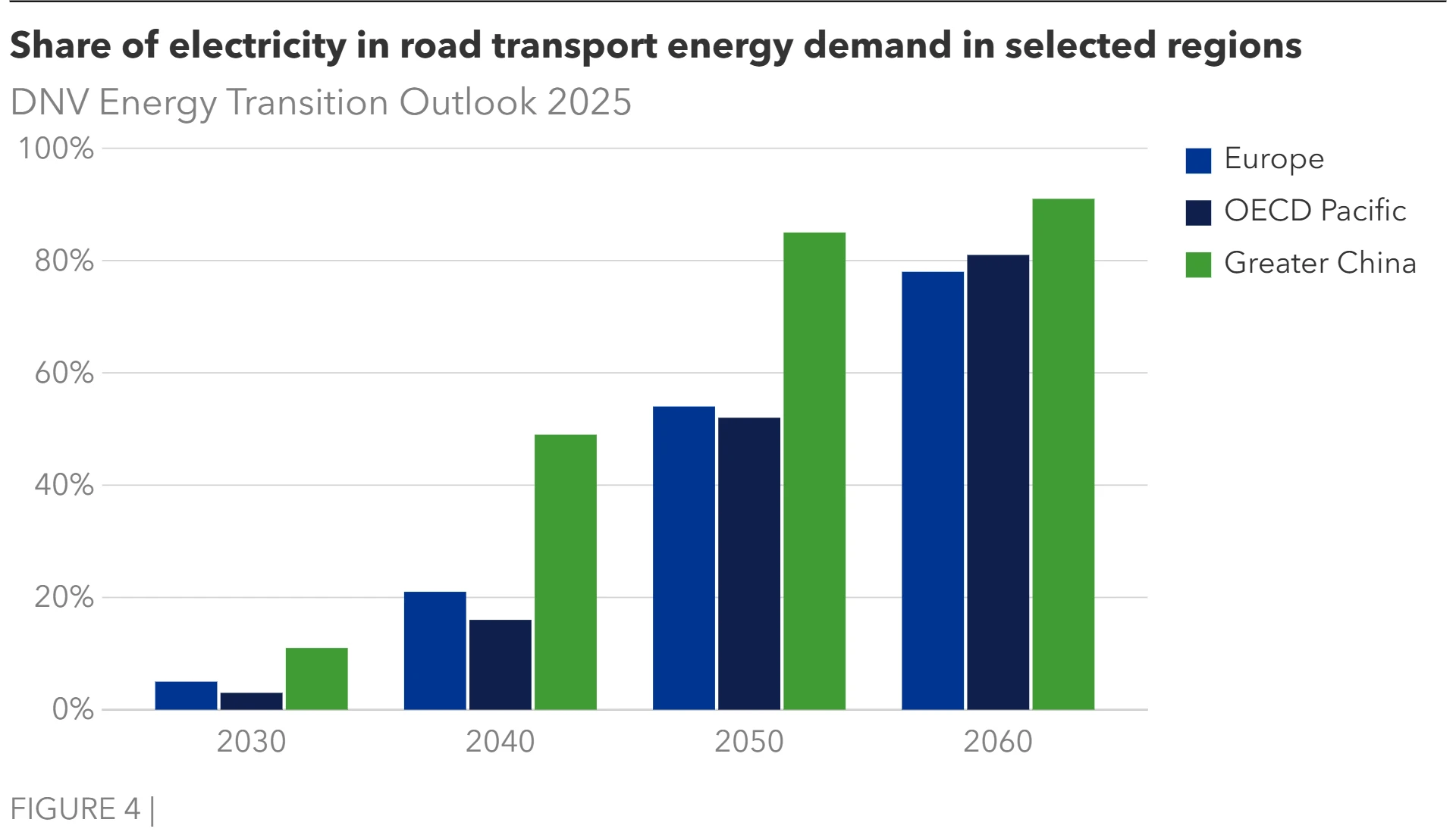 Road transport will see a 58% reduction in energy demand over our forecasting period. This is the result of a transition already underway: in 2025, more basic electric vehicles than internal combustion engine vehicles will be sold. There will be a tripling of fast chargers installed for EVs between 2030 and 2040 (reaching 10 million chargers) as part of the infrastructure investments to support this change. Efficiencies from electrification will result in an especially strong reduction in energy demand between 2030 and 2045, and practically all new vehicles sold will be EVs from the late 2030s, more than 73 million vehicles annually. By 2050, 98% of all vehicles will be electric. Greater China’s speed of transition in road transport will dwarf that in all other regions (see figure/table). Half of the energy demand will already be served by electricity in 2040. Road transport’s energy demand will remain the largest within transport subsectors.