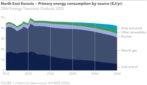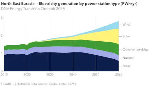North East Eurasia’s energy mix will remain heavily fossil-dependent. Natural gas is the dominant source and will rise slightly from 57% of the mix in 2024 to 59% by 2060. Coal and oil will decline steadily – coal’s share halving by the early 2040s and oil’s share dropping from 17% to 12% by 2060. Meanwhile, the share of solar and wind combined will expand from 0.25% to 12%, surpassing nuclear, though fossil fuels will continue to shape the region’s energy landscape for decades.