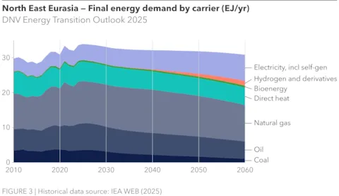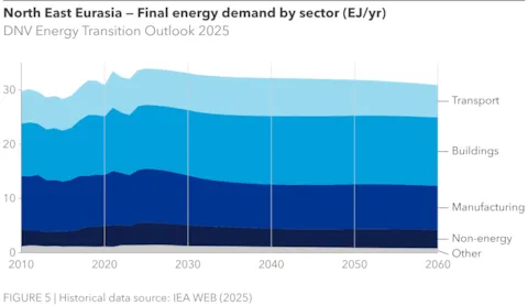 Our forecast suggests that final energy use in North East Eurasia will remain broadly stagnant, with little indication of the structural transformations underway elsewhere. Demand continues to be dominated by heating and industry, which together will account for about two-thirds (67%) of total consumption (Figure 5). Heavy industries such as metallurgy, aluminium smelting, and chemicals will continue playing a particularly large role, underscoring the region’s reliance on resource extraction and energy-intensive manufacturing.