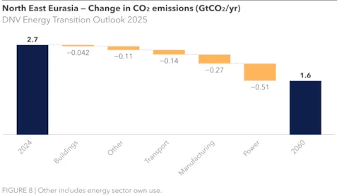 Carbon dioxide emissions in North East Eurasia will fall only 40% between now and 2060, the smallest such decline among the industrialized regions in our Outlook. The power sector will achieve the largest reduction, about 47%, reflecting moderate progress in decarbonization. Manufacturing emissions will decrease slightly less (45%), supported by greater electrification of processes. In contrast, the buildings sector will see only an 11% reduction, as natural gas remains heavily used for space and water heating.