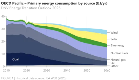 Fossil fuels currently dominate the primary energy mix in OECD Pacific, accounting for 82% of total consumption. However, their share is projected to decline significantly by 2060, falling to just 18%. This reduction will be offset by a substantial rise in renewable and nuclear energy sources. Nuclear will play a major role, making up 32% of the mix in 2060 while solar and wind are expected to be the fastest-growing sources, reaching 25% and 12%, respectively.