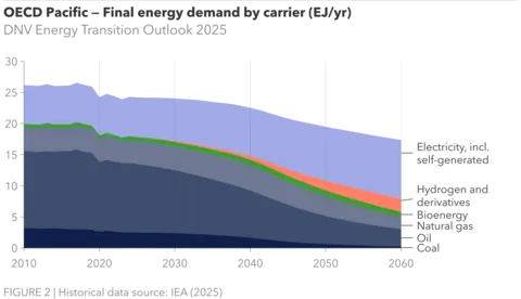 OECD Pacific is a highly industrialized region with a very high standard of living and GDP per capita. The region is geographically disconnected as none of the countries in this region share common borders or connected power grids. Electricity demand will rise despite a declining population, as fossil fuel dependency wanes in a shift towards renewable energy and increased share of nuclear power.