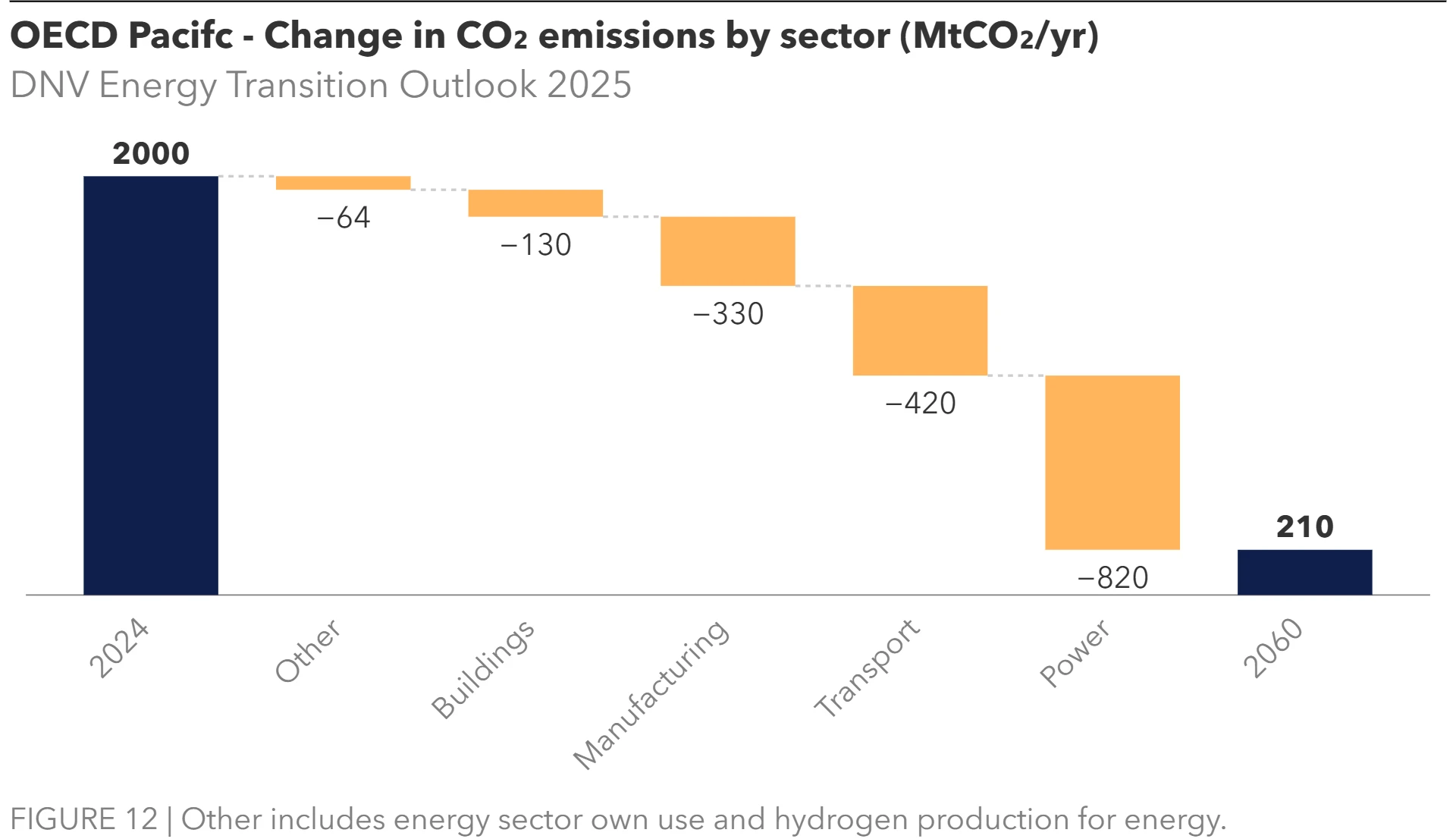 In the context of global climate policy, all four countries in OECD Pacific have committed to net-zero emissions by 2050. Assessment of country pledges in nationally determined contributions (NDCs) suggests an average regional target of reducing GHG emissions by 10% by 2030, relative to 1990 levels. We forecast energy- and process-related CO2 emissions – after CCS and direct air capture (DAC) – to decrease 9% by 2030, indicating that the region will almost meet this ambition level. Looking ahead, declining primary energy use, combined with declining population, will lead to emissions falling continuously through the forecast period. By 2060, emissions are forecast to decline by 89% from 2024 levels, driven by reduction in coal use and increased adoption of renewables.
