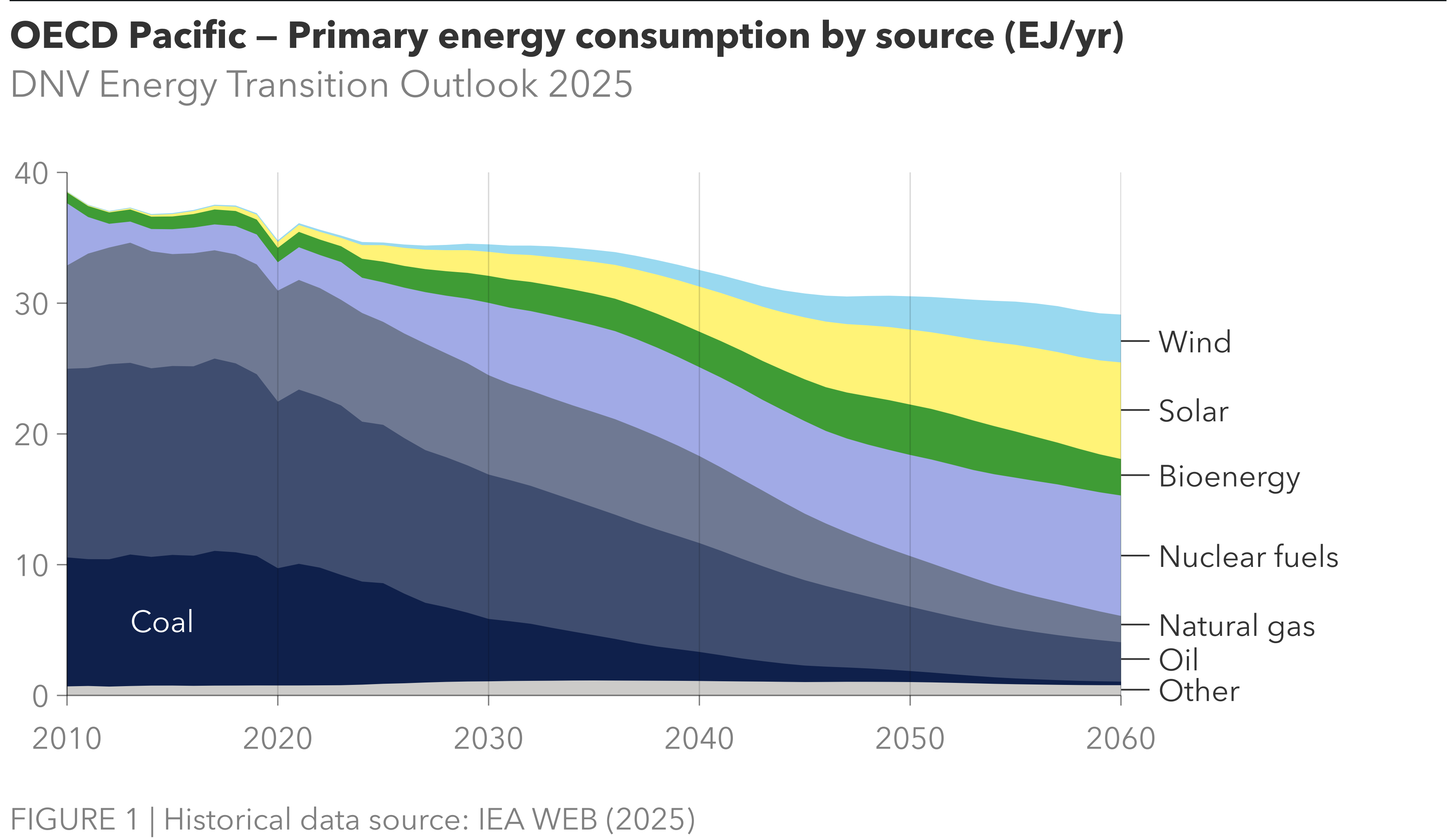 Fossil fuels currently dominate the primary energy mix in OECD Pacific, accounting for 82% of total consumption. However, their share is projected to decline significantly by 2060, falling to just 18%. This reduction will be offset by a substantial rise in renewable and nuclear energy sources. Nuclear will play a major role, making up 32% of the mix in 2060 while solar and wind are expected to be the fastest-growing sources, reaching 25% and 12%, respectively.