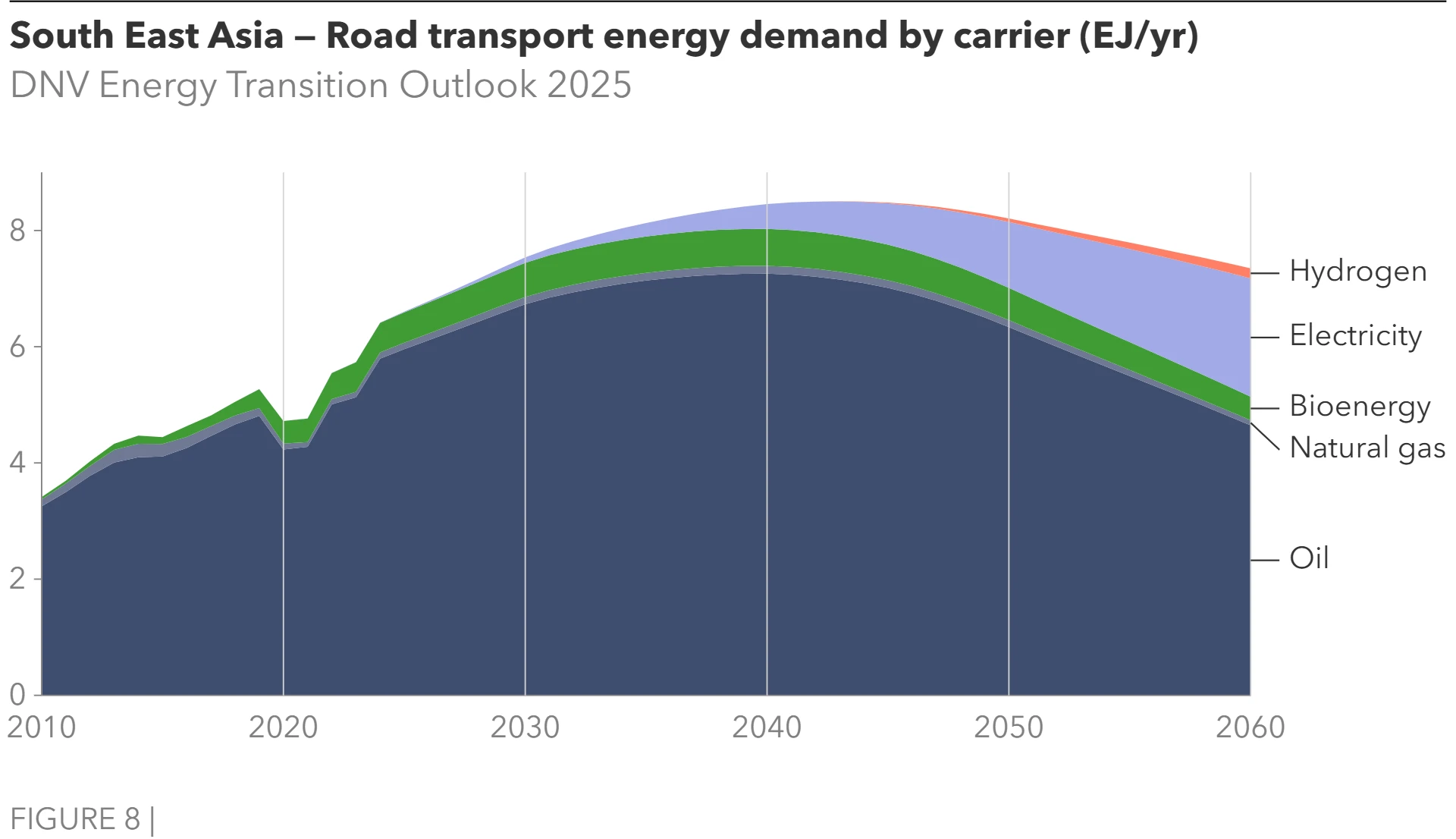 Transport represents a huge opportunity for decarbonization in South East Asia via electrification of the road transport fleet. Today, road transport oil demand is 5.8 EJ/yr, which accounts for around 57% of the region’s oil demand. We project that road transport oil demand will continue growing as the population grows and becomes wealthier, increasing the demand for passenger vehicles (four-wheelers). We expect oil demand from road transport to grow to a peak of 7.3 EJ in the early 2040s, before declining to around 4.7 EJ in 2060 as electrification becomes more common (Figure 8).