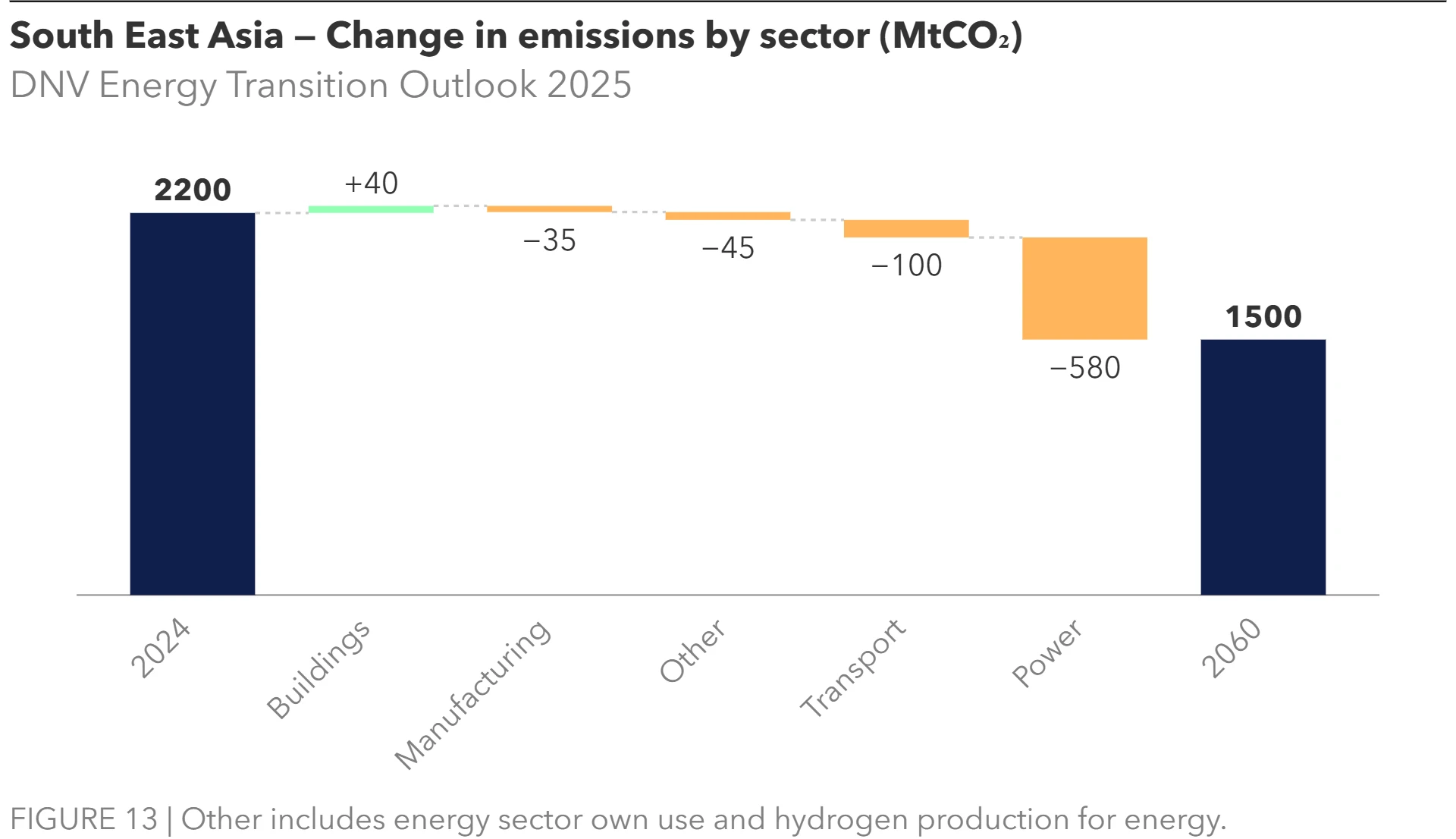 Carbon dioxide emissions in South East Asia are expected to peak around 2030 and then plateau just below this until a proper decline starts in the mid-2040s. Power is the main sector for decarbonization, reducing emissions nearly 70% by 2060, achieved by phasing out coal and the uptake of solar. Transport sees a modest 17% decline, while manufacturing sees only a small decrease in emissions and buildings a slight increase.