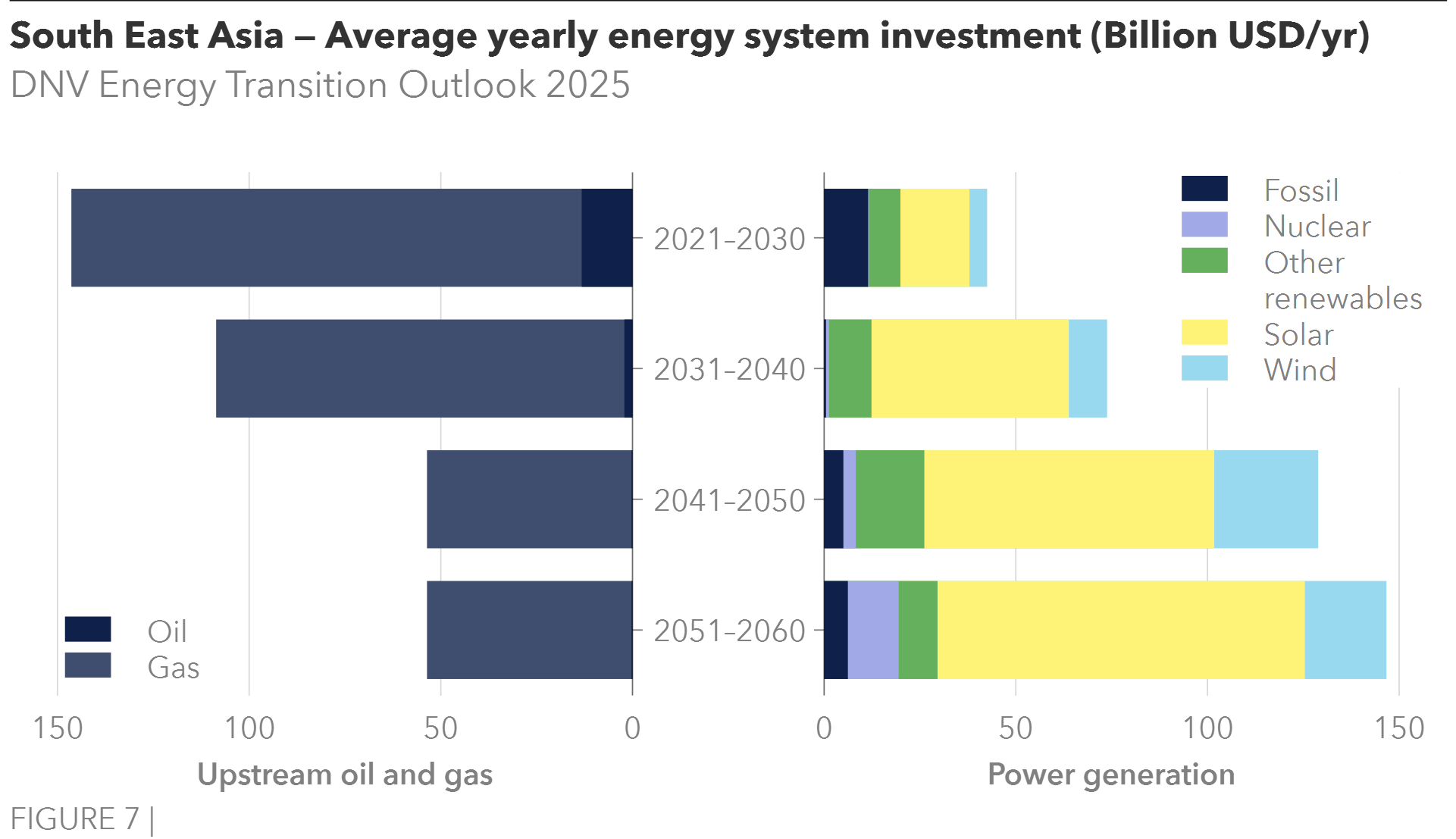 Local production is expected to increase, bolstered by deepwater discoveries in Indonesia and Malaysia in the past few years. In May 2025, Malaysia released new guidelines for developing regasification terminals, which are critical for LNG imports, exemplifying plans for the region to leverage gas resources in the medium term. As countries embark on decarbonization pathways that involve gas as a transition fuel, they are attracting investment from major energy companies globally. Investment in upstream fossil fuel production in the 2020s and 2030s is focused on securing domestic production and limiting dependence on imports, especially gas (Figure 7).