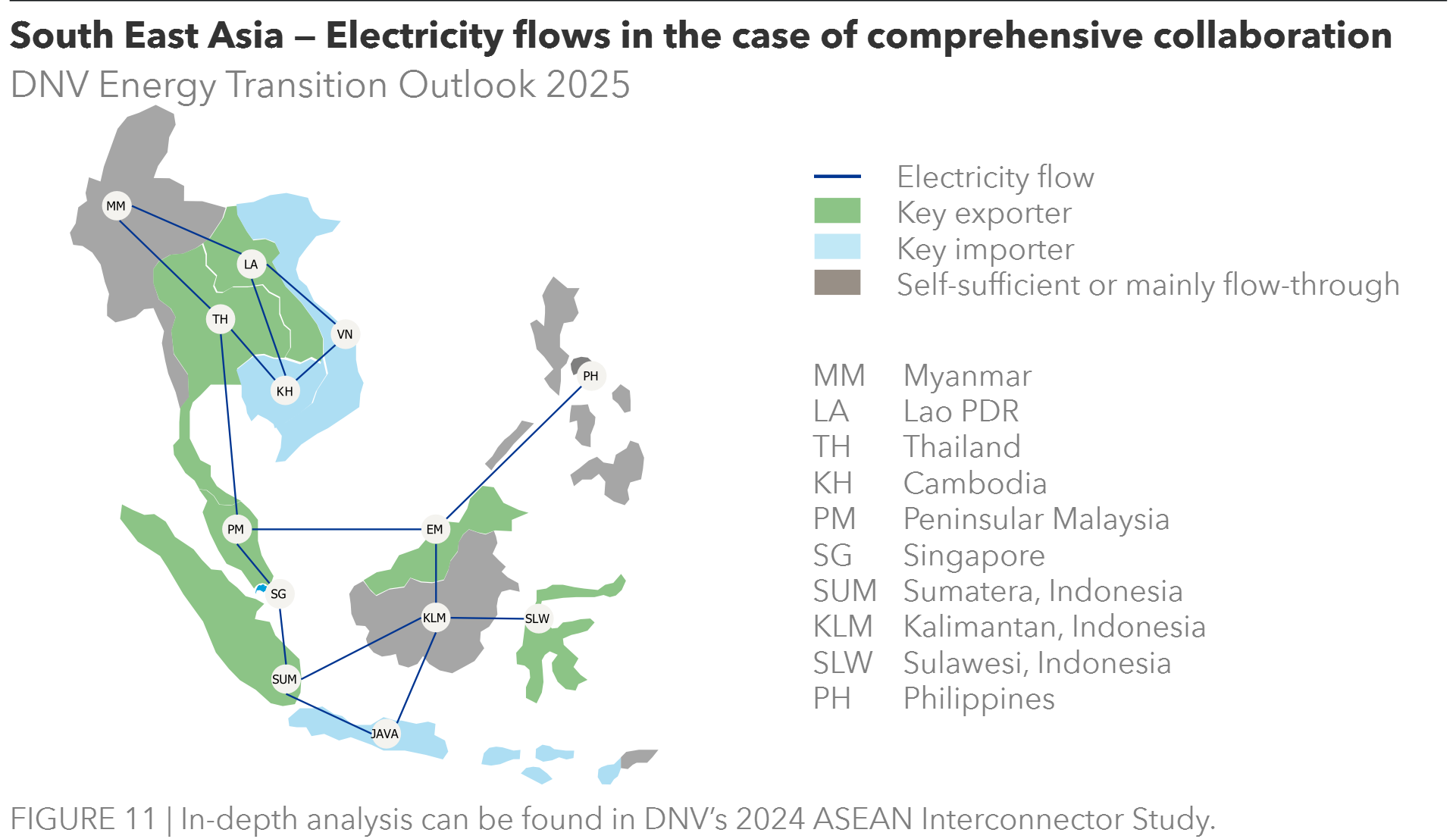 DNV’s 2024 ASEAN Interconnector Study: Taking a Regional Approach to Decarbonization provides an in-depth analysis of the ASEAN power sector. The report identifies that up to USD 800bn could be saved through comprehensive regional collaboration when compared to individual countries pursuing decarbonization goals without cooperation. Even moderate collaboration could lead to USD 300bn savings. The significant cost and space saving benefits encompass power interconnectors, hydrogen networks, and energy storage technologies and infrastructure. Countries with a diversified supply of solar, wind, and hydropower resources (e.g. Thailand and Lao PDR) will be the main exporters of clean energy within the region.