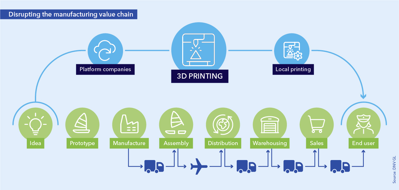 In a groundbreaking project, the well-known ship management company Wilhelmsen Ship Management launched an exclusive early adopter programme with six Wilhelmsen customers to test the practicability and feasibility of a subscription concept: each customer pays a monthly fee for an unspecified number of 3D-printed plastic spare parts of a specific type deliverable on demand. During the ramp-up phase, these parts are made and delivered from the Singapore-based Wilhelmsen Ships Service facility. If successful, the Wilhelmsen global network will also offer spare parts-as-a-service in other ports such as Rotterdam. DNV GL’s Simon Ratcliffe says: “I believe we will see printing hubs in many places yachts frequent, instead of parts flying around on aircraft.”
