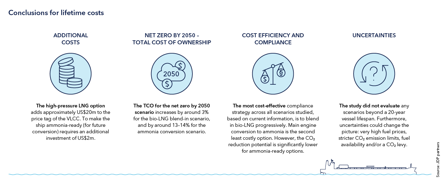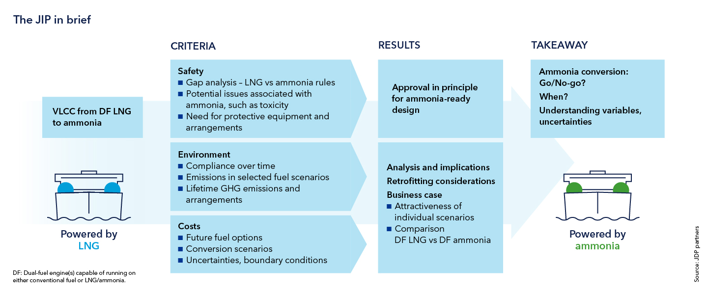 In a joint industry project, DNV and its partners investigated the rationale of ammonia as a future fuel for a new LNG dual-fuel VLCC tanker design and the business cases for converting the vessel to ammonia and compared it to other alternatives.