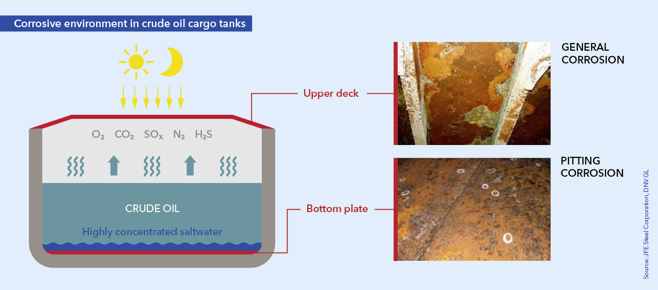 Crude oil is a complex mixture of substances at varying ratios and in most cases contains at least some salt water. Even after desalination some of this brine remains dissolved in the crude and gradually sinks to the bottom of the cargo oil tank during transport. The corrosive nature of salt, along with microorganisms and other aggressive substances contained in the cargo oil, causes rust, most notably in the form of pitting, which are cavities in the steel that deepen over time.