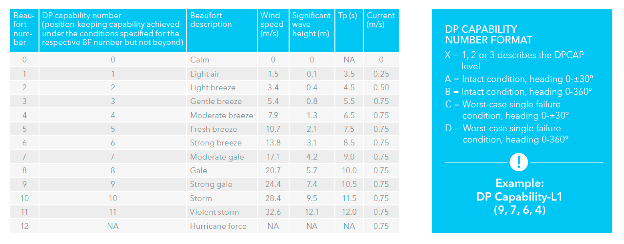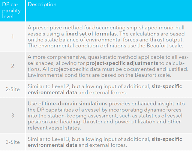 The DP capability number indicates that the position-keeping ability of the respective vessel can be maintained under the conditions defined for the respective capability level and all conditions below, but not under the environmental conditions specified for the next higher DP capability number. In addition the standard defines two DP capability assessment levels allowing the inclusion of site-specific environmental data and external forces: Level 2-Site and 3-Site (refer to table at the end). The additional site-specific levels are provided for cases where it is desirable to include site-related environmental and other special operational data which differ from the data specified for the relevant DP capability level. Since these calculations are not based on the Beaufort environment the result is not represented in the form of a DP capability number but as a plot indicating the relevant wind speed limits for the given conditions.