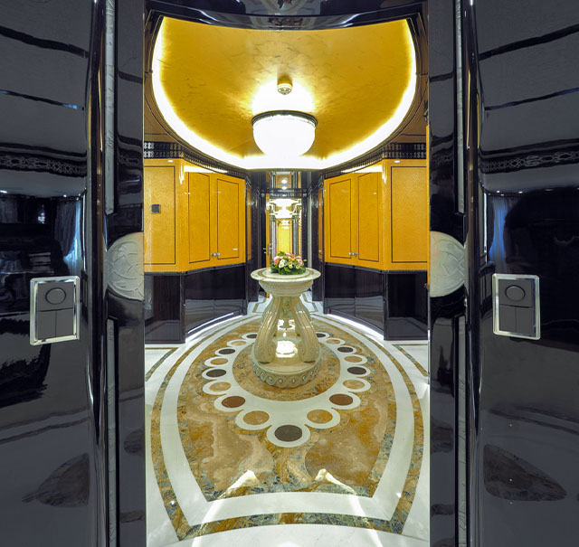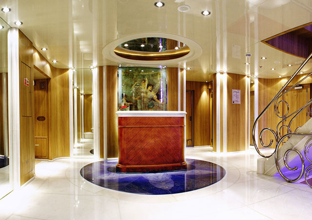 “In our role as the interior designers and naval architects, we did not wish to use imitation materials, such as faux-wood, marble-effect, etc., but only original materials,” explains Dafnias. “The saying ‘all that glitters is not gold’ does not apply in this case. Everything should be what it appears to be and it should also be authentic. So the design should ‘conceal’ equipment such as the A Class doors, the steel B Class door frames but also the lifeboats and their cranes, etc. and additionally, distribute the wood allowed by Regulations using ‘smart’ design for fire load calculations. Furthermore, large quantities of marble and other stones were used and this increased the weight, which affected the stability of the vessel. This was yet another issue to solve, all the more taking into consideration the stricter SOLAS requirements.”