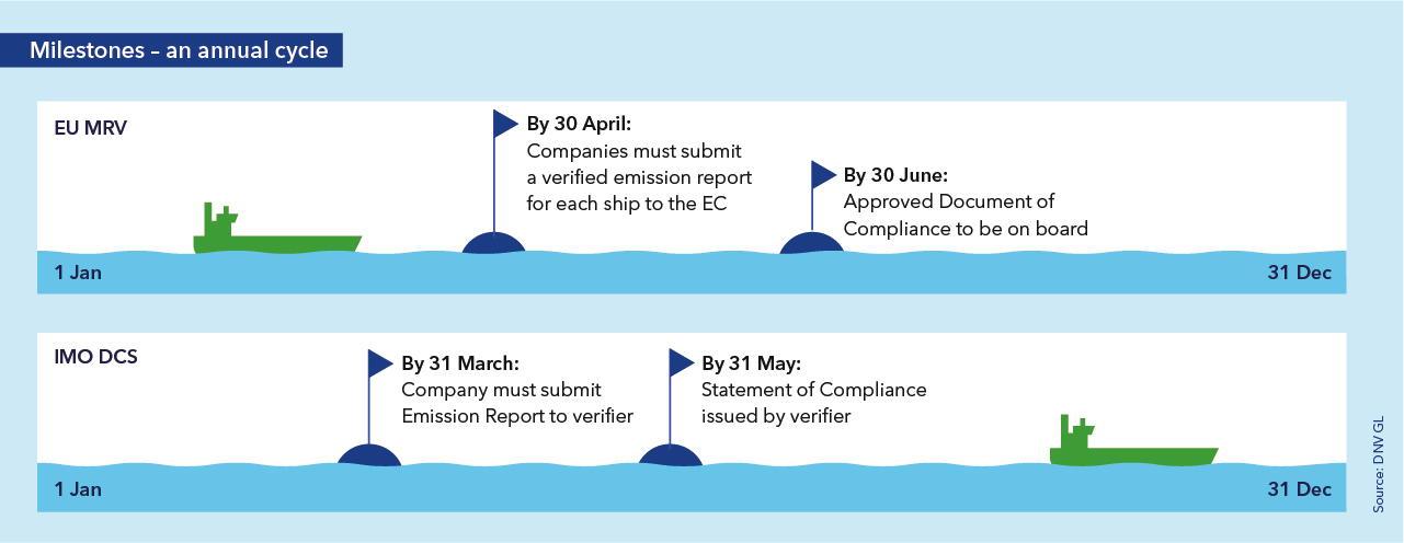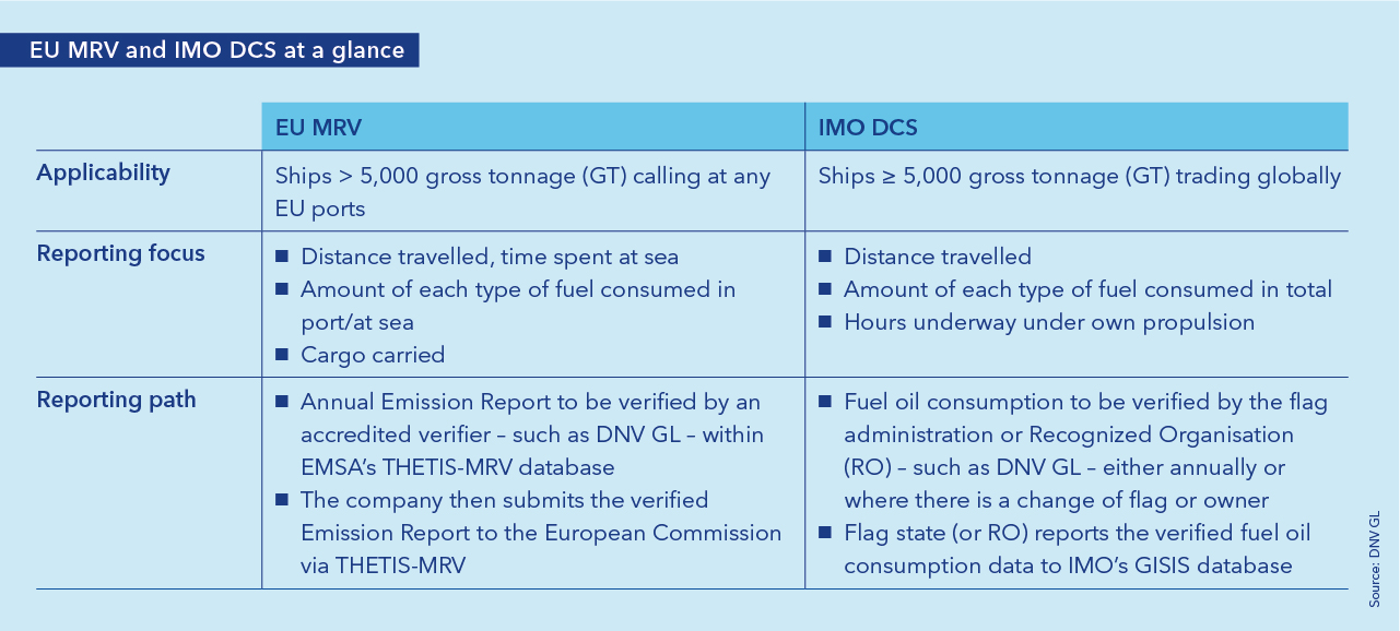 The good news, says Berenika Markiewicz, MRV/DCS Team Lead Digital Class Services at DNV GL, is that DNV GL, as both a verifier for the MRV Regulation and a recognized organization (RO) for the flag states, which are in charge of DCS verification, has created a single reporting process for both schemes that minimizes the effort for the ship operator. “Shipping companies submit one set of reports – their bunker details and log abstracts – to DNV GL’s online system, which automatically differentiates between the requirements of the two reporting schemes,” says Markiewicz. “And whether the customer prefers a manual data collection process or uses advanced digital technology, we only ask for typical, basic data that is routinely recorded on every vessel, whether digitally or in logbooks.”