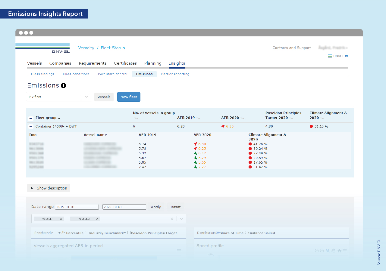 - The Emissions Insights Dashboard of the Fleet Status portal on DNV GL’s Veracity platform unlocks the economic value of the emissions data.