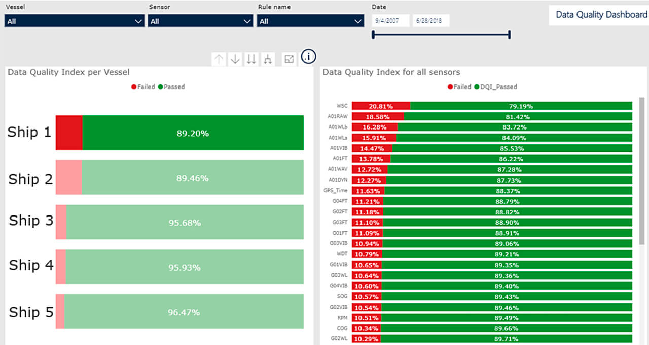 The term sensor, for the purposes of this discussion, includes not only sensors in the narrow sense but also the output of transducers and indicators as well as numerical and hybrid sensing elements. The DNV GL hull monitoring rules associated with the HMON class notation basically cover any sensor type. They require automatic on-board processing and storing of statistical data, which can be uploaded by the supplier to the Veracity cloud automatically or manually after conversion to the compact Veracity format. The quality dashboard then reads the data and presents it on a web interface. Any data quality issue is evident promptly, and data quality improvements following maintenance by the supplier can be confirmed by the system.