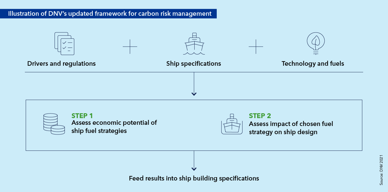 To assist shipowners in responding to the drive for decarbonization, DNV charts a practical path to stay under the carbon reduction trajectories. Maritime Forecast to 2050 presents an updated carbon risk-management framework (Figure 1) for finding the most cost-efficient Fuel Ready and fuel flexible choices for vessels.