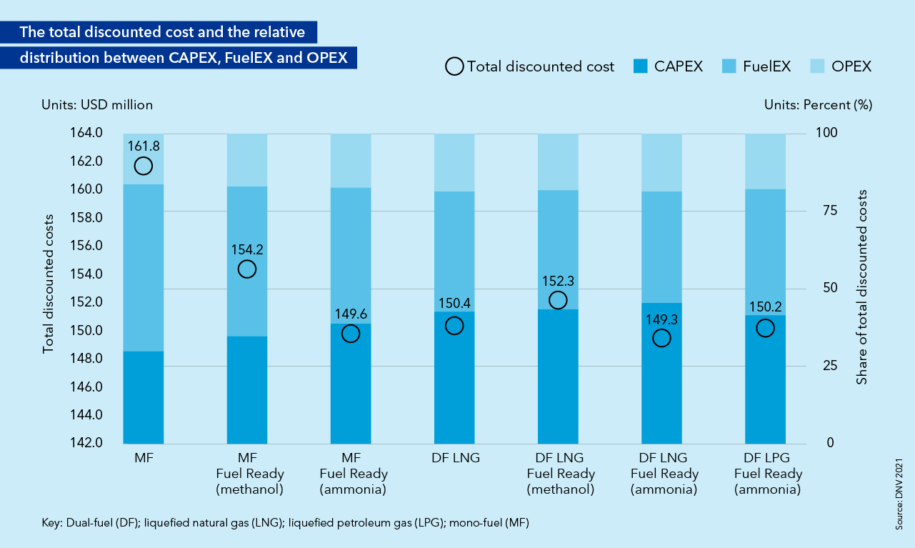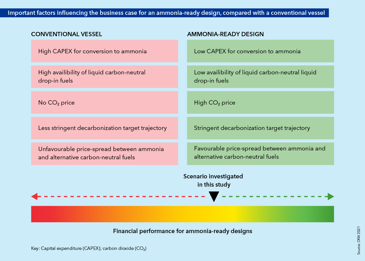The ammonia-ready design solutions would have a higher CAPEX but comparatively lower FuelEX than the conventional option in their lifetimes.