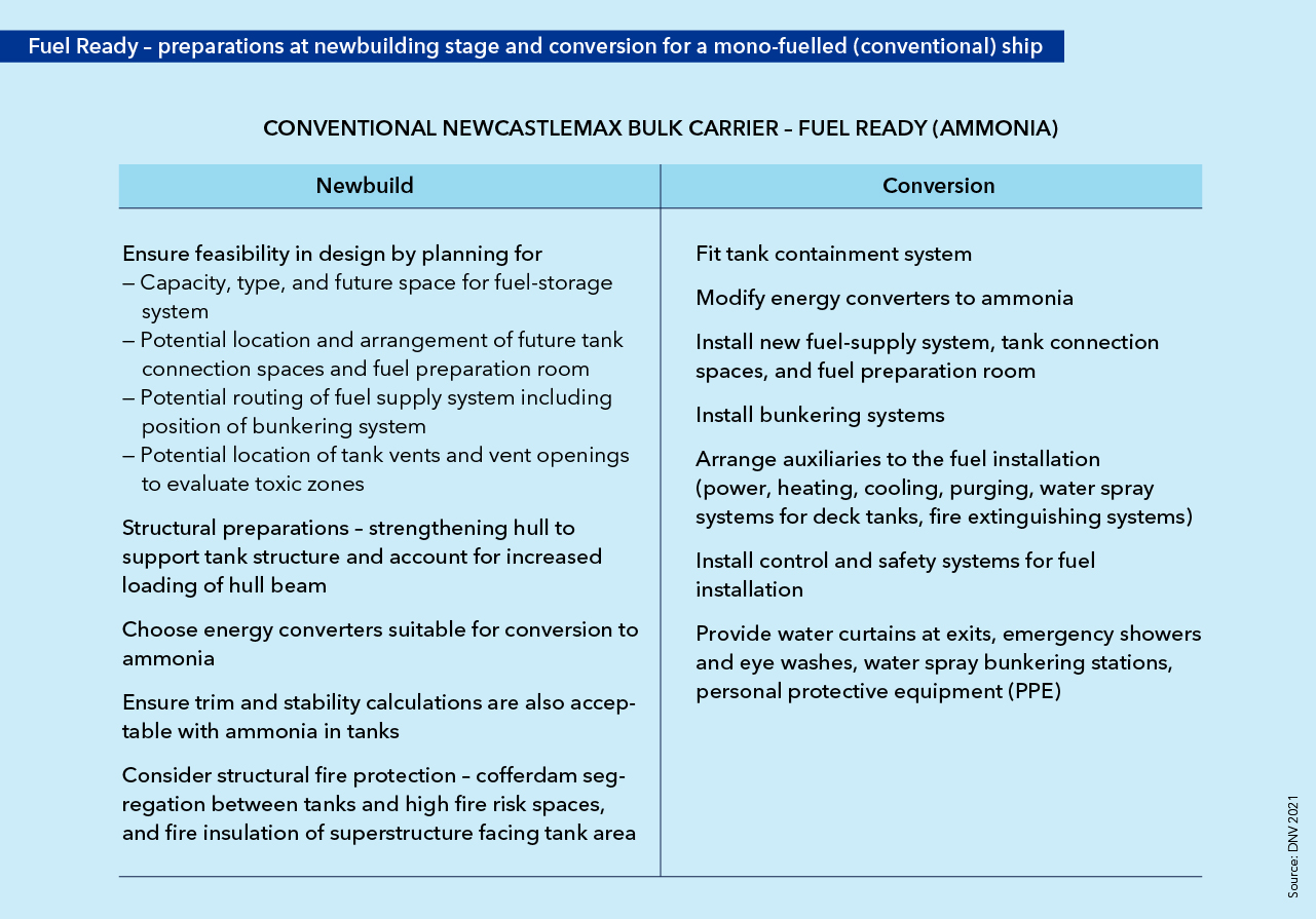 For example, the table below shows action points that emerge from the review of what is needed to prepare the case study Newcastlemax bulk carrier for conversion from mono-fuel (conventional) to be ready to switch to ammonia as fuel.