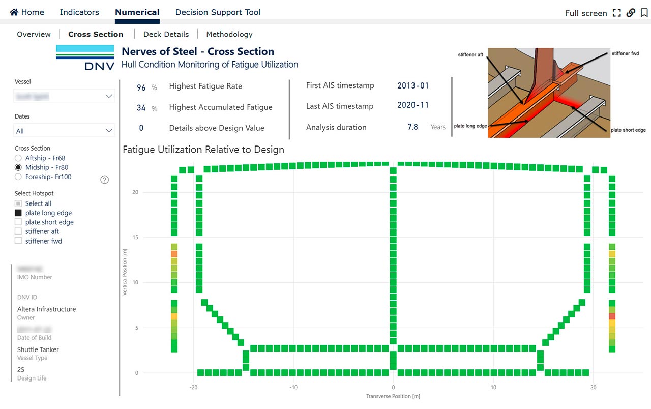 According to Antonio Goncalves, Business Lead (Maritime Advisory) at DNV, the organization worked to develop a tool called “Nerves of Steel” that can provide a more dynamic overview, which not only helps explain past findings, but also allows owners to predict the future degradation of the vessel. “Simply by pairing a vessel’s location using AIS data with asset-specific information, we can calculate wave loads on the hull with far more accuracy,” he explains. “And by applying DNV’s hull integrity analytical expertise and other relevant data, we can provide owners and other stakeholders with better decision support.”