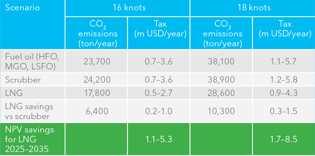 A number of factors that can have a significant impact on the final results remain unpredictable, including the development of fuel prices, which will depend on demand as well as potential political measures. The study therefore considered various but not all conceivable price scenarios. While low-sulphur fuel oil (LSFO) will likely be the most expensive compliance option, the cost performance of LNG ranges between LSFO and HFO, depending on the assumed LNG market price. In the most favourable scenario, LNG approximates the cost of the scrubber-equipped ship, especially so in the 18-knot example. However, it should be noted that LNG offers additional benefits in terms of particulate matter and CO2 emissions. DNV GL therefore included calculations of potential savings under an assumed CO2 taxation or trading scheme, which would further improve the feasibility of LNG.
