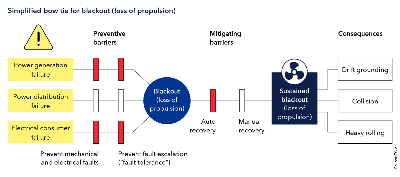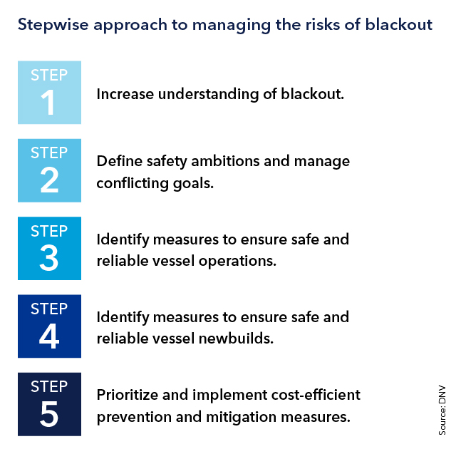 In its paper, DNV introduces a five-step model for managing blackout and loss of propulsion risks both for ships in operation and newbuilds. This presents a user-friendly, logical progression examining the underlying interrelated causes of faults that lead to blackout and resulting loss of propulsion, and the factors influencing successful recovery. Each step culminates in recommendations and best practice based on insights from incident statistics, literature reviews, workshops with key operators and collaboration with experts. Learnings have also been drawn from other segments, particularly offshore, which traditionally has a very strong safety regime.