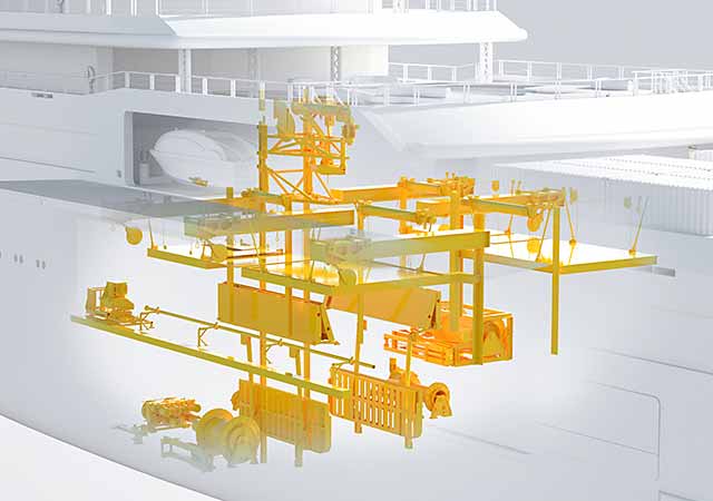 Øino notes: “It is always a challenge to launch and retrieve any kind of tender, especially an AUV (autonomous underwater vehicle) – like the one we put on our first large explorer yacht and are putting on the REV. AUVs carry sonars, have no umbilical and are programmed to map the seabed and come up to a predefined point – you pick it up, take out the data and deploy it again. An ROV (remotely operated vehicle) normally has an umbilical but you still have to lift it in and out, so remotely operated releasing and pick-up hooks are an important detail.
