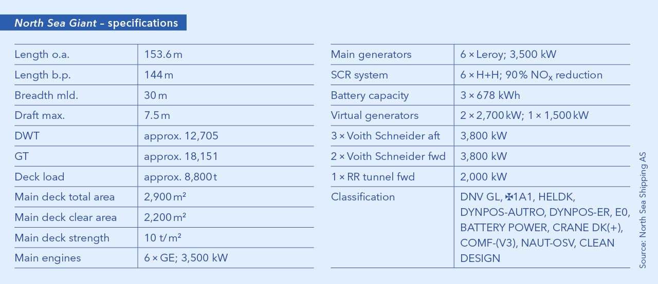 When North Sea Giant was delivered to her Norwegian owner, North Sea Shipping AS, in 2011 she was the world’s most advanced offshore construction vessel. After an upgrade including the installation of triple-redundant battery banks she can claim that title again.