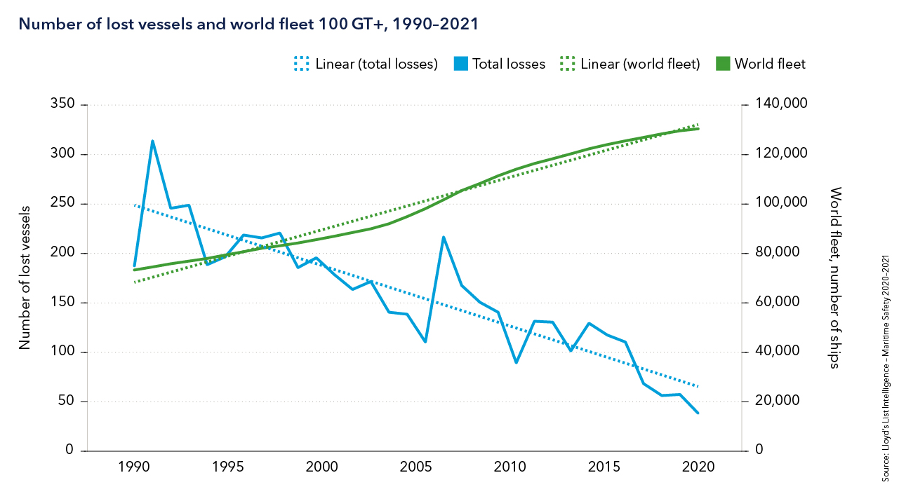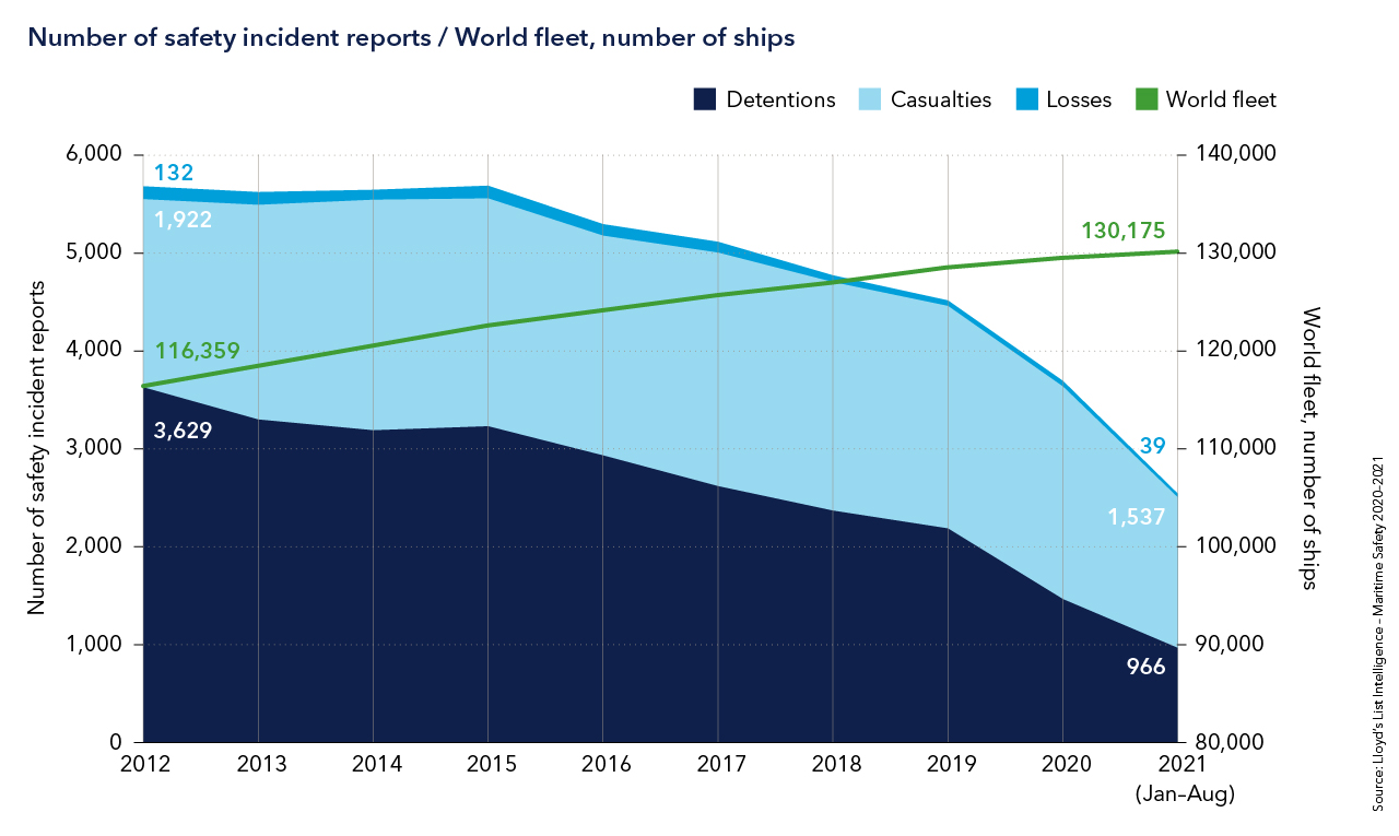 At the same time, the global fleet has increased significantly from 116,000 to 130,175 ships with a total tonnage of 2.3 billion deadweight tonnes as of August 2021 – an increase of 16% in number and 46% in deadweight tonnes. Consequently, the number of safety incidents as a proportion of the fleet has fallen from nearly 5% to only 2% over the course of the decade.