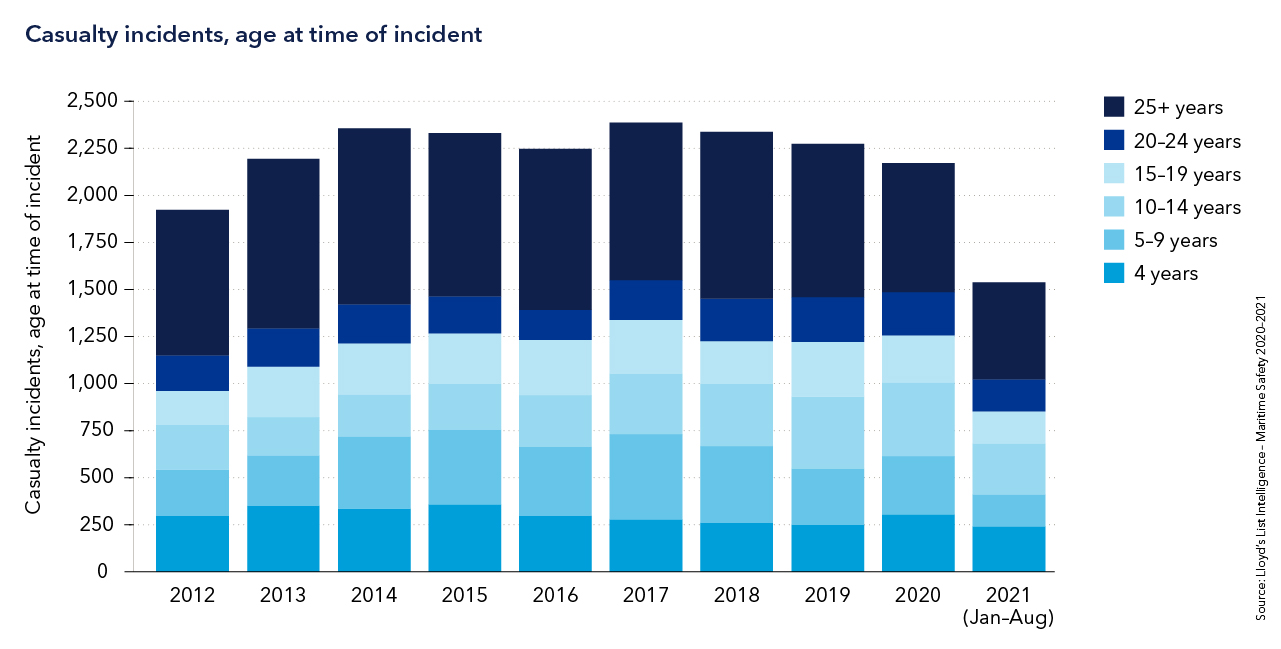 The statistics also show that around one-third of 21,746 casualties over the period occurred with vessels aged over 25 years, with older general cargo carriers and passenger vessels accounting for the highest number of casualties. These represent large fleets of smaller vessels often engaged in low-margin operations, resulting in older ships with lower capital costs and less fleet renewal.