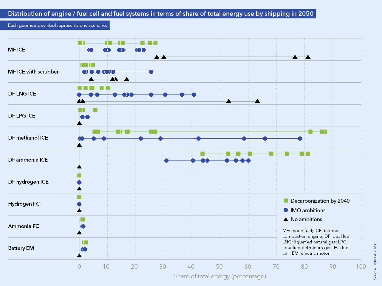 “It is difficult to identify clear winners among many different fuel options across all scenarios,” Longva points out. “However, e-ammonia, blue ammonia and bio-methanol frequently model with a high market share in the decarbonization scenarios and are the most promising carbon-neutral fuels in the long run.”
