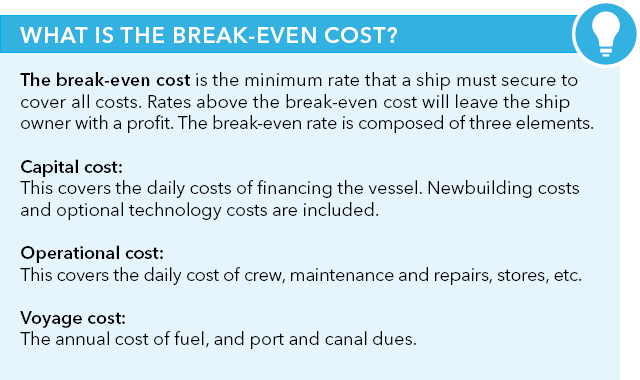 The core of the carbon-robust model lies in evaluating different fuel and technology options by comparing the break-even costs (the minimum rate that a ship must secure to cover all costs) of a design to that of the competing fleet of ships under different scenarios. The break-even cost is the minimum rate that a ship must secure to cover all its costs.
