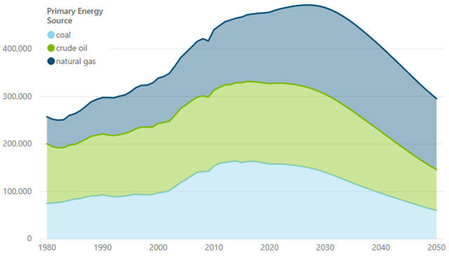 DNV GL sees global final energy demand peaking in 2033 at a level of 16% above today’s, then declining slowly. Energy supply will peak at around the same time, and consumption of thermal fuels will decrease, impacting maritime transport of coal and oil. Figure 1 illustrates the global forecast of the primary energy supply from fossil sources.