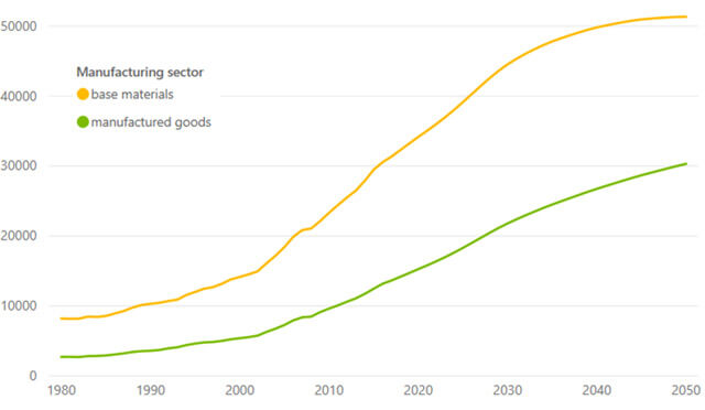 Looking at non-energy trades, the ETO model incorporates regional manufacturing of finished goods (e.g. construction equipment, electronics, food, machinery and textiles) and the use of raw materials (e.g. chemicals, iron and steel, other metals, paper, pulp and wood) to produce them. Figure 2 shows the forecasted global manufacturing demand towards 2050.