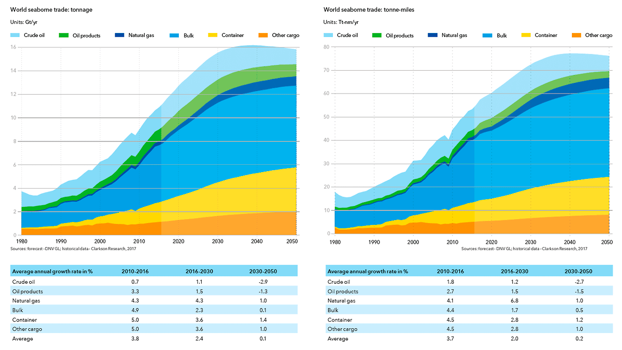 DNV GL forecasts a 39% rise in seaborne trade measured in tonnes over the 2016–2030 period, and a 2% rise for 2030–2050. Seaborne transport is projected to increase in all trade segments except crude oil and oil products, which should peak in around 2030.
