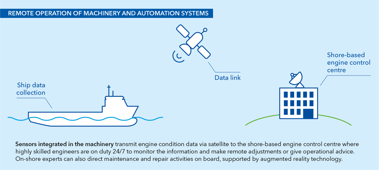 The IAS network on board is connected with the ECC by a reliable and redundant ship-to-shore communication link. Portable communication devices and AR equipment are used not only for troubleshooting, but also to ensure efficient support of the crew from the ECC. A wide range of normal and abnormal operations, conditions and scenarios have been mapped and a division of responsibility between the ECC and on-board crew established.