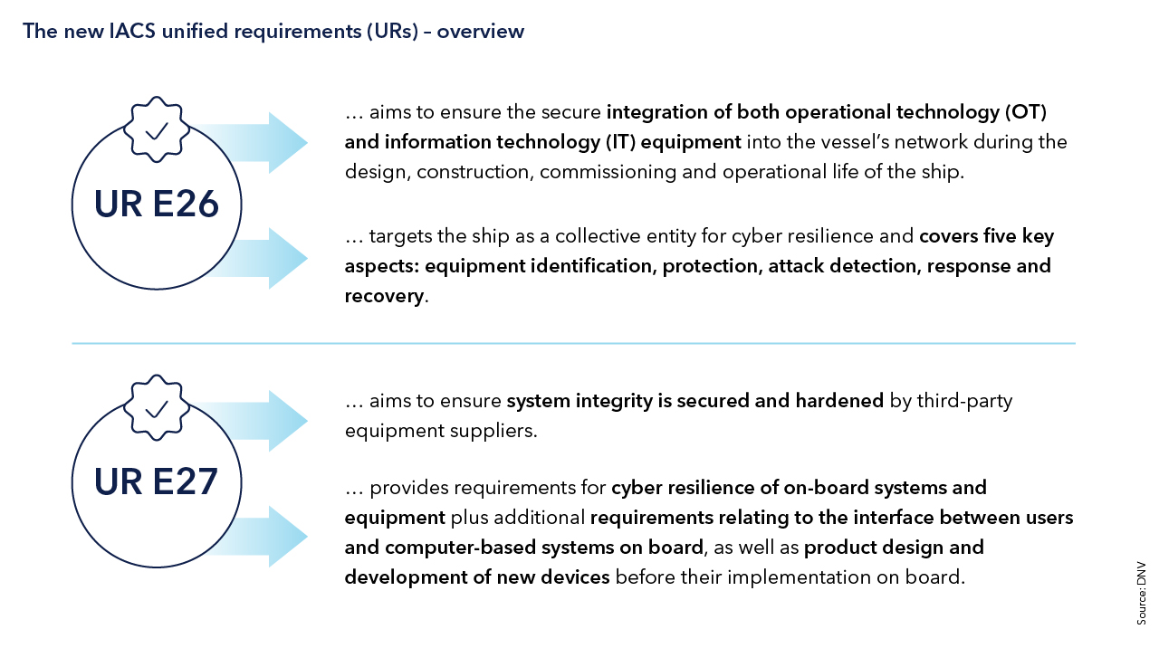 Firstly, UR E26 aims to ensure the secure integration of both Operational Technology (OT) and Information Technology (IT) equipment into the vessel’s network during the design, construction, commissioning and operational life of the ship. This UR targets the ship as a collective entity for cyber resilience and covers five key aspects: equipment identification, protection, attack detection, response and recovery.