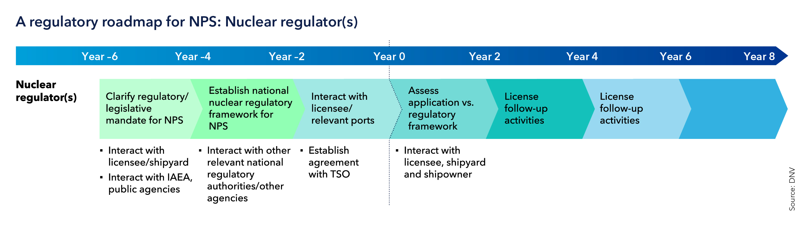 This will involve multiple actors, ranging from existing maritime organisations like the IMO and Flag states, to established players in the nuclear space, such as the IAEA. Classification societies, like DNV, also have a significant role to play and can help to overcome fragmentation and foster a standardized maritime approach. The white paper describes how all of these actors can contribute to the future maritime nuclear industry, using regulatory roadmaps to plot their likely pathways ahead.