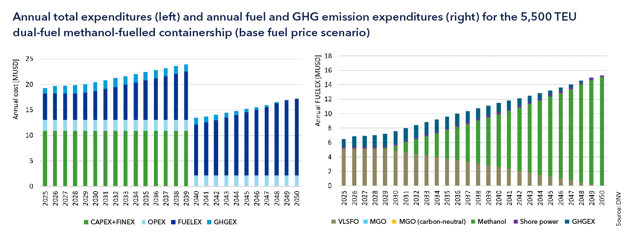 Future expenditures incurred for greenhouse gas emissions from burning fossil fuels will mainly be driven by the EU Emission Trading Scheme (EU ETS), which requires CO2 emission certificates to be carried on board. For the analysis of the 5,500 TEU containership, DNV used the CO2 price modelled in its Energy Transition Outlook, assuming slightly higher prices to account for recent market developments and a likely future change of the calculation method from tank-to-wake to well-to-wake, which in July 2023 was also agreed to by IMO.