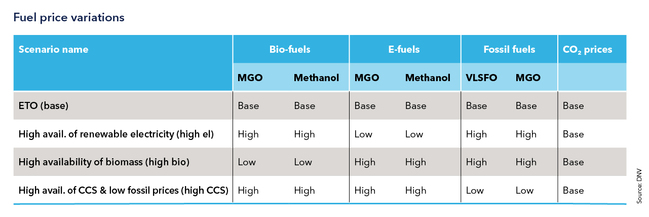 DNV based its analysis on three assumptions: (a) that the IMO Carbon Intensity Index (CII) will be the main driver for the fuel mix a ship will be operating on in the near future, and the IMO ambition has been adjusted to achieve 100% decarbonization by 2050; (b) the results of the DNV Energy Transition Outlook (ETO) as a base scenario for fuel price predictions, and three additional scenarios spanning potentially extreme variations between the price developments for fossil fuels (VLSFO/MGO) and carbon-neutral fuels (e- or bio-MGO/methanol); and (c) a CO2 pricing scenario based on ETO modelling but raised slightly to reflect the anticipated new decarbonization ambition by 2050.