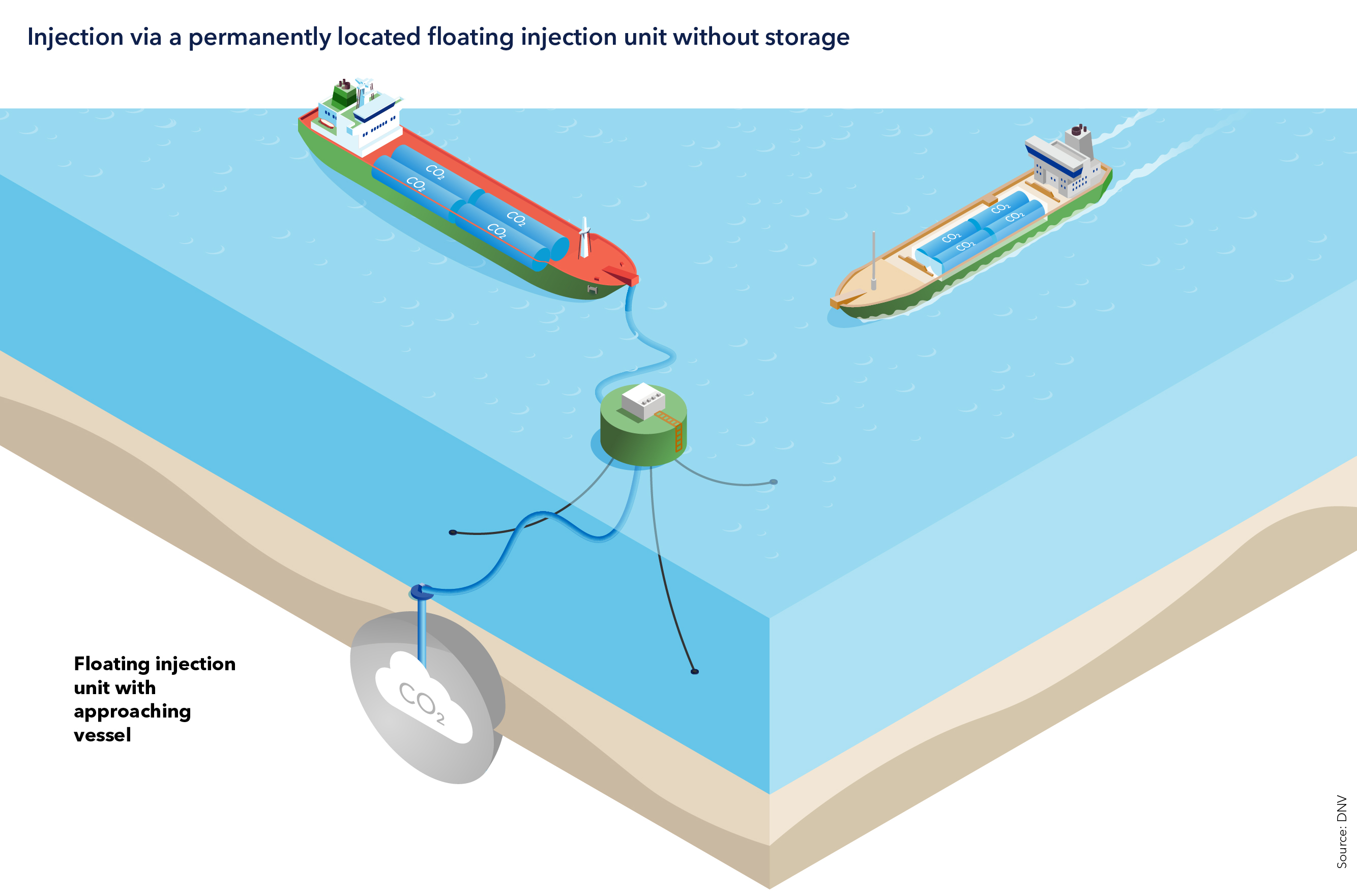 The actual injection of the CO2 transported to an injection site may be achieved by different measures, including direct injection from the shuttle tanker, injection via a permanently positioned bottom-fixed injection installation, and injection via a permanently located floating injection unit with or without storage.