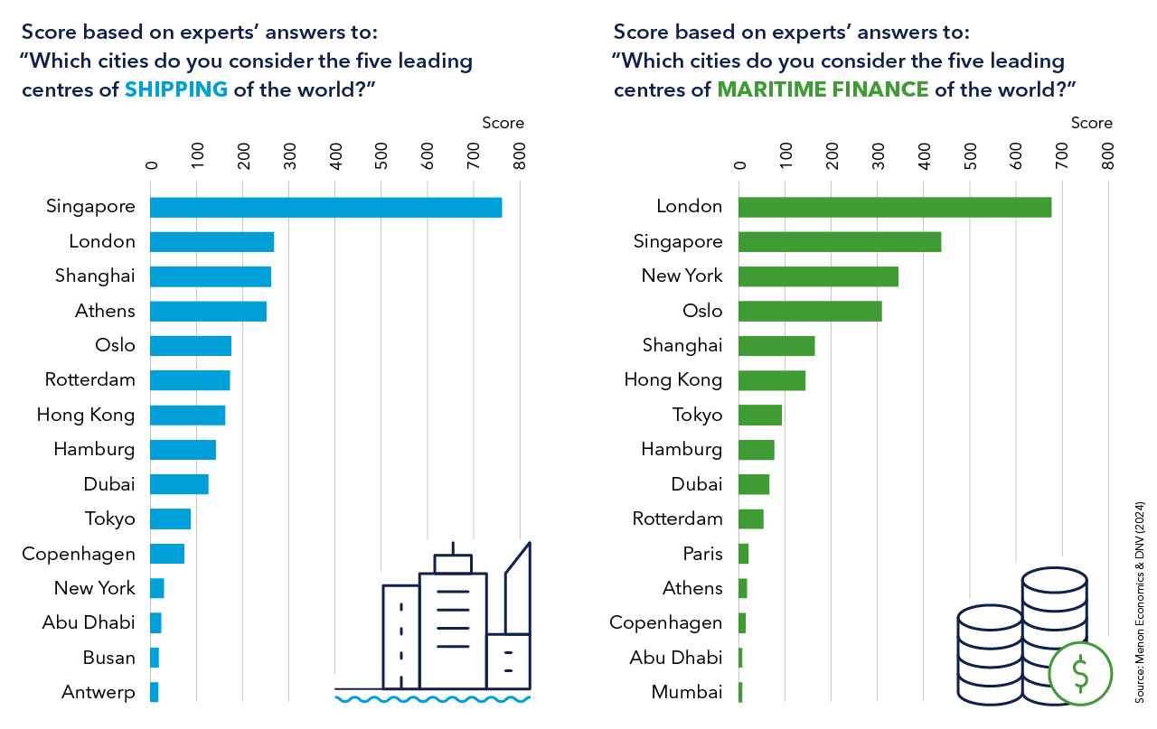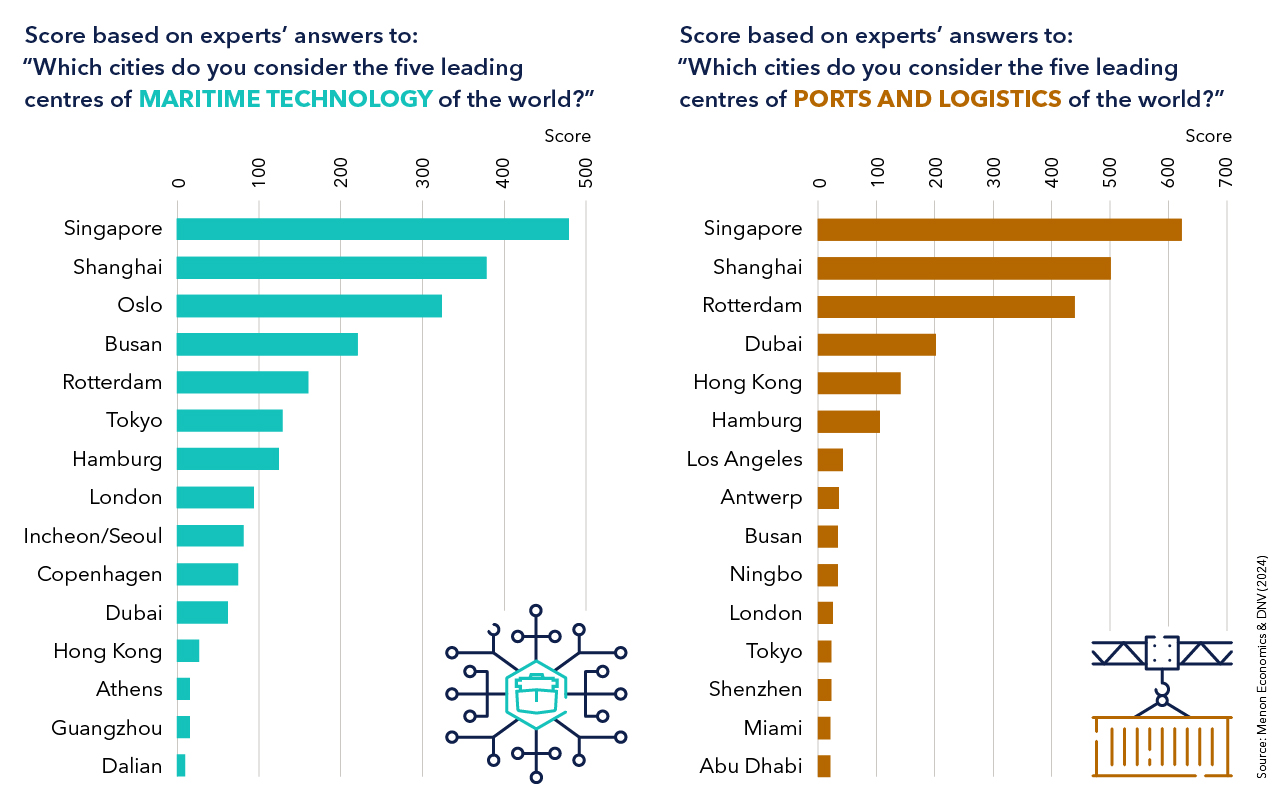 Like in the previous edition of this report in 2022, a combination of objective and subjective indicators are used to rank the different cities. Singapore was once again recognized as the leading maritime city, followed by Rotterdam and London, with Shanghai and Oslo making up the remainder of the top five. The Asian city-state hit the top spot in three out of the report’s five pillars, retaining its position as leader in Attractiveness and Competitiveness and overtaking Athens and Shanghai in Shipping Centres and Ports and Logistics. Much of this is due to Singapore’s strong positioning towards decarbonization.