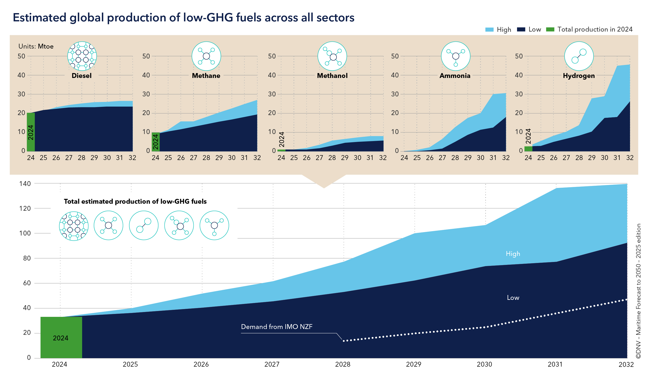 In 2023, global energy demand reached 10,600 Mtoe, with maritime transport accounting for 3 per cent. As competition for low-GHG fuels intensifies, especially from aviation, trucking and industry, Maritime Forecast to 2050 estimates global production capacity by fuel type, offering high and low scenarios based on RED II sustainability criteria. Despite delays, projected capacity for 2030 is 70–100 Mtoe (for all sectors and including biodiesel), up 50 per cent from last year due to the inclusion of bio-methane. Yet only 4 per cent of hydrogen-derived projects have reached a final investment decision, and just 1 per cent are operational. Maritime fuel demand under the NZF is also assessed in the report.