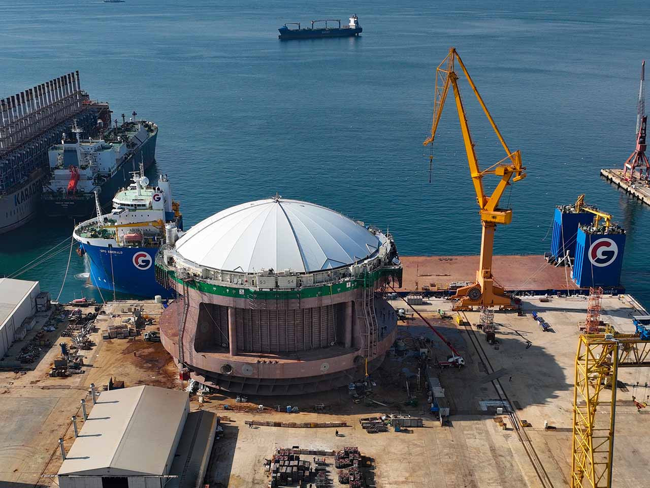 It was an impressive sight to see at the Gemak shipyard in Turkey in summer 2025: a massive circular structure standing 30 metres tall and 72 metres in diameter, vaguely reminiscent of an ancient amphitheatre. Made of 5,000 tonnes of steel, the innovative, semi-enclosed Nordlaks HYDRA salmon farm dwarfed the people and machines around it. Loaded onto the huge semi-submersible heavy-lift carrier that was to take it to its destination in northern Norway, the unit overhung both sides of the vessel by twelve metres.