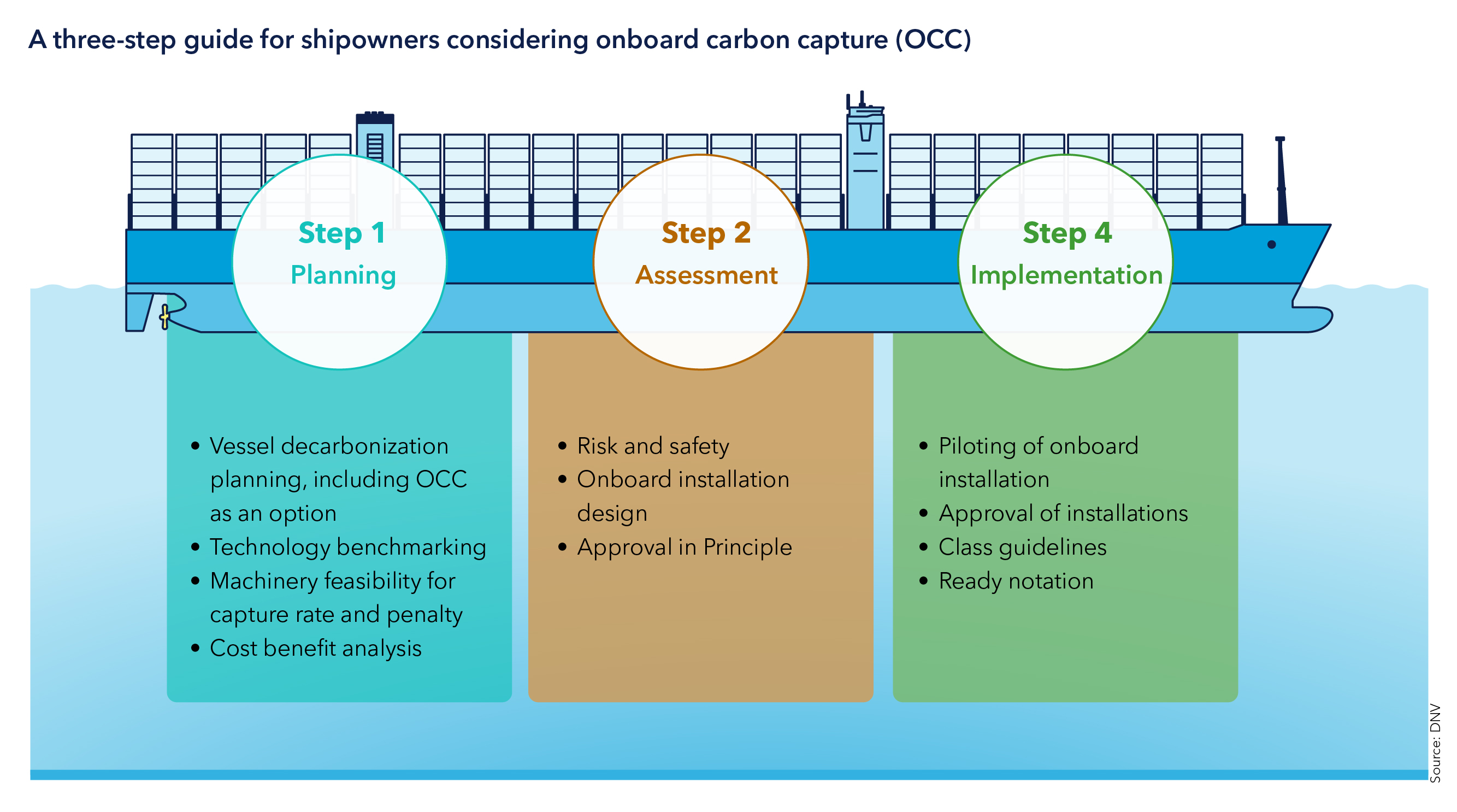 IMO plans to incorporate the application of onboard carbon capture in the IMO Lifecycle Assessment (LCA) Guidelines. DNV has published guidelines for the safe installation of onboard carbon capture, as well as comprehensive storage and classification rules, and offers its OCCS and OCCS Ready class notations. Flag state administrations have the final say on accepting these guidelines and may impose additional requirements for safe implementation on board.